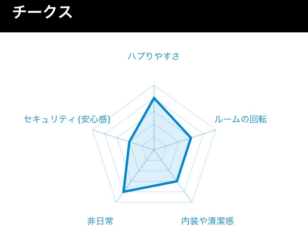| チークス | 栄駅 徒歩7分 | 9,000円(入会金1,000円込み) | 女性店員が多く露出度高め/ロッカー等追加料金あり/土足 | 男性は若め/女性はやや年齢高め |