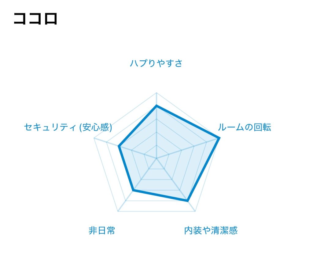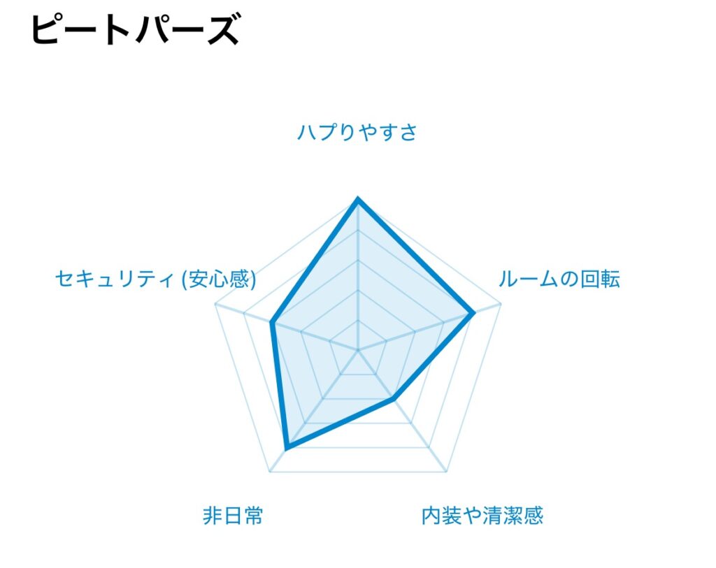 各店舗の5角形チャートは、約10ヶ月でハプバー約80店舗に遊びに行った管理人独自の見解です。数字が高い、低いでお店を評価するものでは決してございません。ハプバー選びの参考になれば幸いです。
