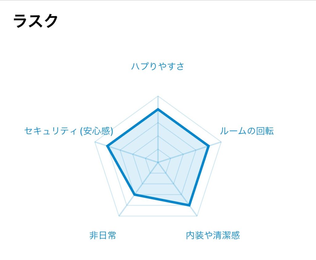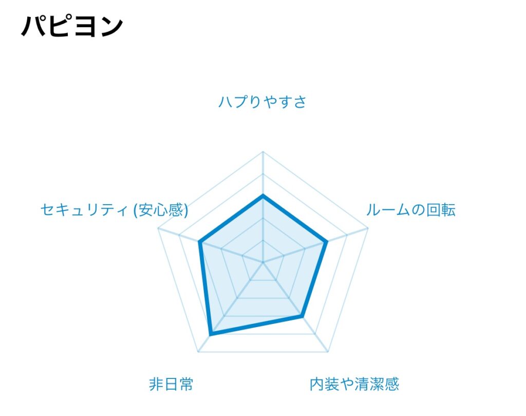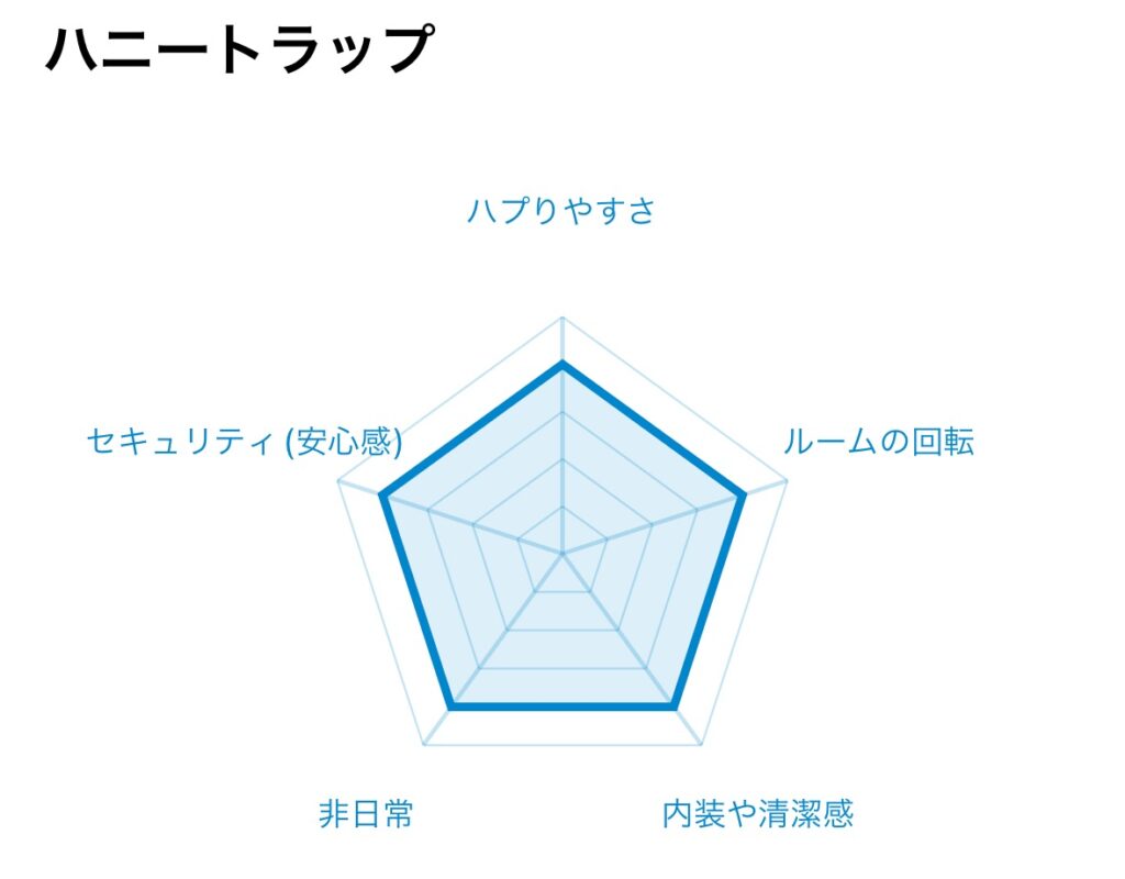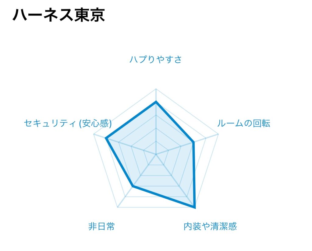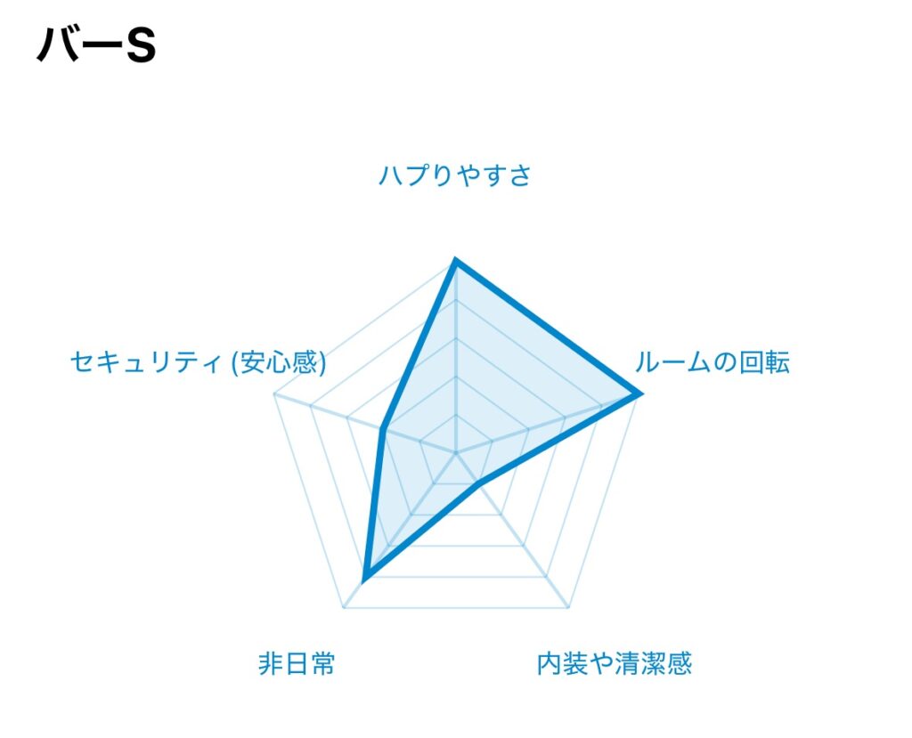 各店舗の5角形チャートは、約10ヶ月でハプバー約80店舗に遊びに行った管理人独自の見解です。数字が高い、低いでお店を評価するものでは決してございません。ハプバー選びの参考になれば幸いです。