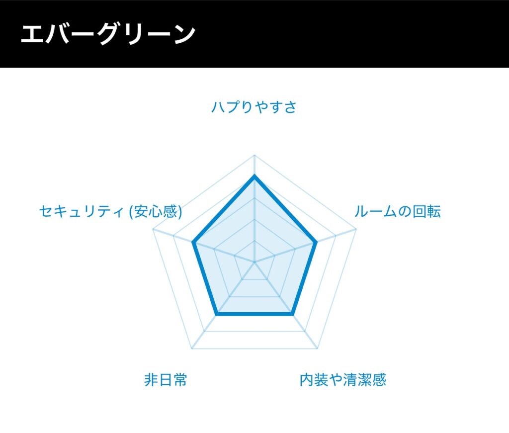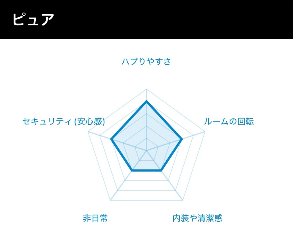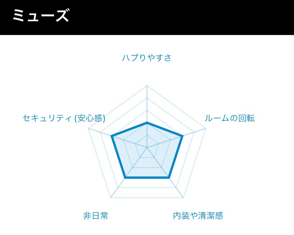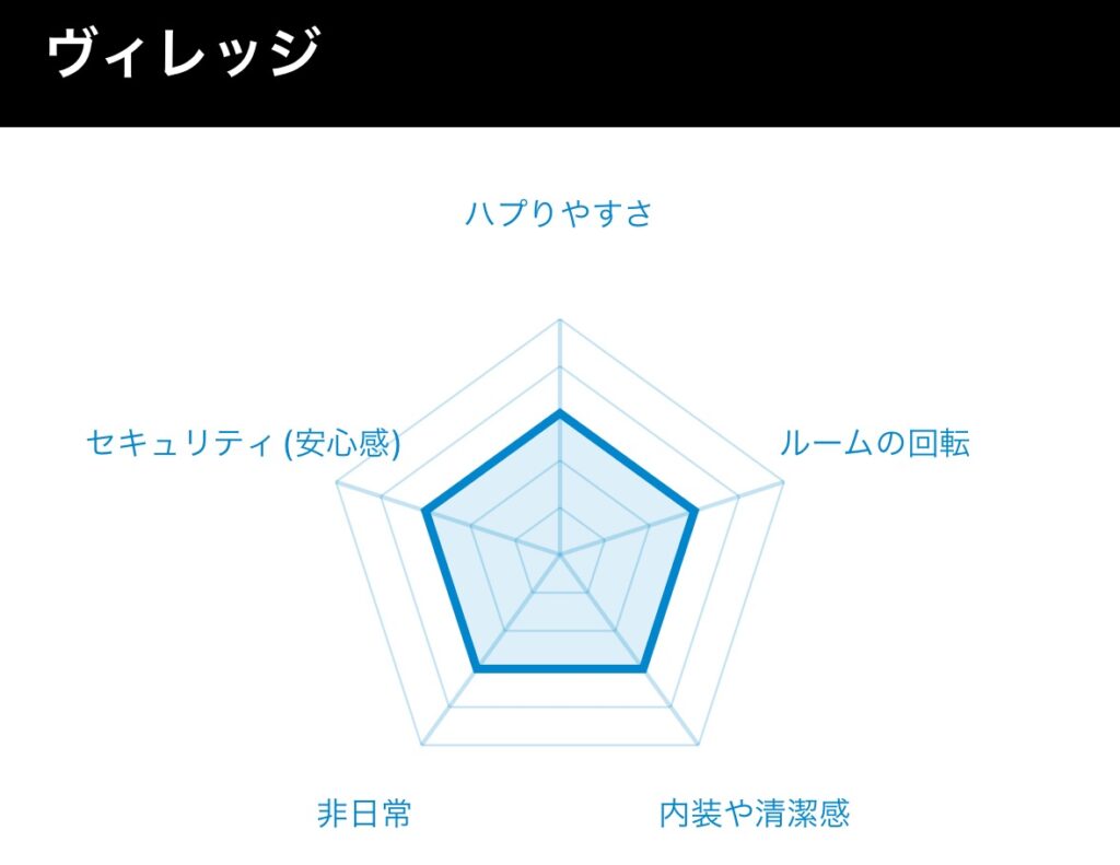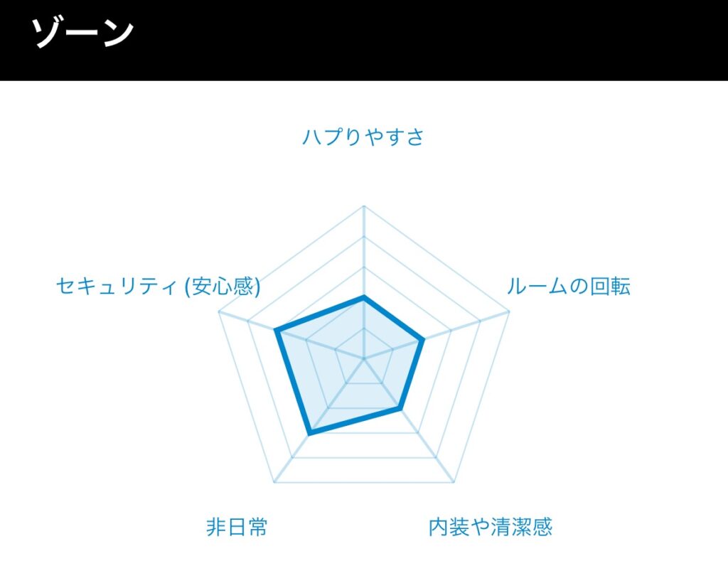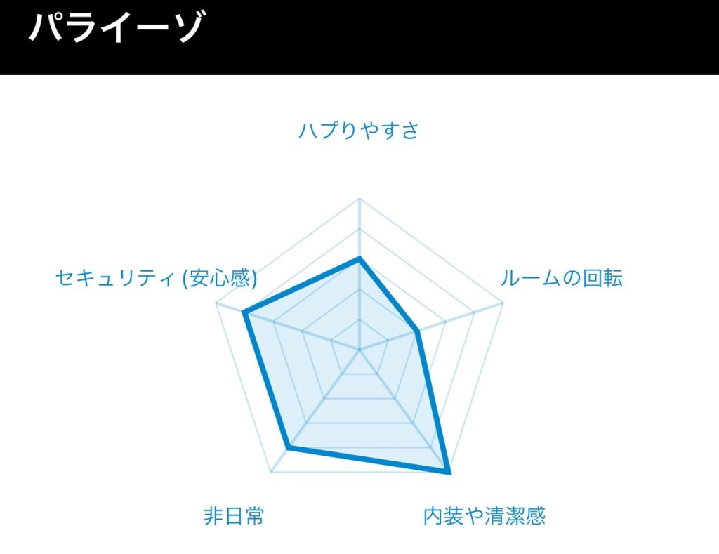 各店舗の5角形チャートは、約10ヶ月でハプバー約80店舗に遊びに行った管理人独自の見解です。数字が高い、低いでお店を評価するものでは決してございません。ハプバー選びの参考になれば幸いです。